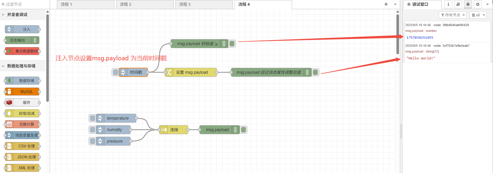 点击注入按钮,触发消息,msg.payload 设置的是当前时间戳,通过 消息属性调整 节点,将 msg.payload 设置为 Hello World!
