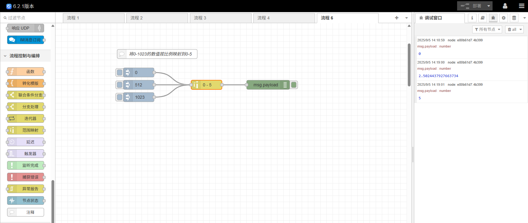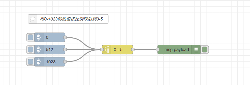 [{"id":"80dae67d.b4d8f8","type":"inject","z":"714695530b415411","name":"","repeat":"","crontab":"","once":false,"topic":"","payload":"0","payloadType":"num","x":270,"y":460,"wires":[["81f13534.456348"]]},{"id":"81f13534.456348","type":"range","z":"714695530b415411","minin":"0","maxin":"1023","minout":"0","maxout":"5","action":"clamp","round":false,"property":"payload","name":"","x":490,"y":500,"wires":[["e80b61d7.4b399"]]},{"id":"cb21de23.75a2f","type":"inject","z":"714695530b415411","name":"","repeat":"","crontab":"","once":false,"topic":"","payload":"512","payloadType":"num","x":270,"y":500,"wires":[["81f13534.456348"]]},{"id":"342552de.255a1e","type":"inject","z":"714695530b415411","name":"","props":[{"p":"payload"},{"p":"topic","vt":"str"}],"repeat":"","crontab":"","once":false,"onceDelay":"","topic":"","payload":"1023","payloadType":"num","x":270,"y":540,"wires":[["81f13534.456348"]]},{"id":"e80b61d7.4b399","type":"debug","z":"714695530b415411","logName":"","active":true,"tosidebar":true,"console":false,"tostatus":false,"complete":"payload","targetType":"msg","statusVal":"","statusType":"auto","logLevel":"info","dataType":"field","syntax":"mustache","template":"","x":690,"y":500,"wires":[]},{"id":"445f9693641f89ed","type":"comment","z":"714695530b415411","name":"将0-1023的数值按比例映射到0-5","info":"","x":330,"y":400,"wires":[]}]